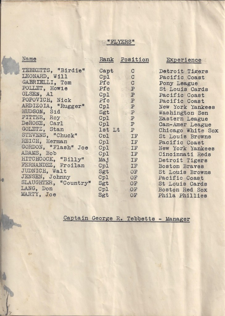 Named the Saipan-Tinian-Guam (S.T.G.) League (also referred to as the 20th Air Force Servicemen’s League), the circuit consisted of three teams: the 58th Bombardment Wing “Wingmen;” the 73rd Bombardment Wing “Bombers” and the 313th Bombardment Wing “Flyers,” each club representing one of the 20th Air Force’s units.[39] Walt Judnich was assigned to the Flyers, with Brooklyn’s Lew Riggs managing and playing third base. Fellow Bellows teammates Bobby Adams, Ed Chandler, Bill Leonard, Burl Storie, Johnny Sturm, and Max West joined Walt on the Flyers.