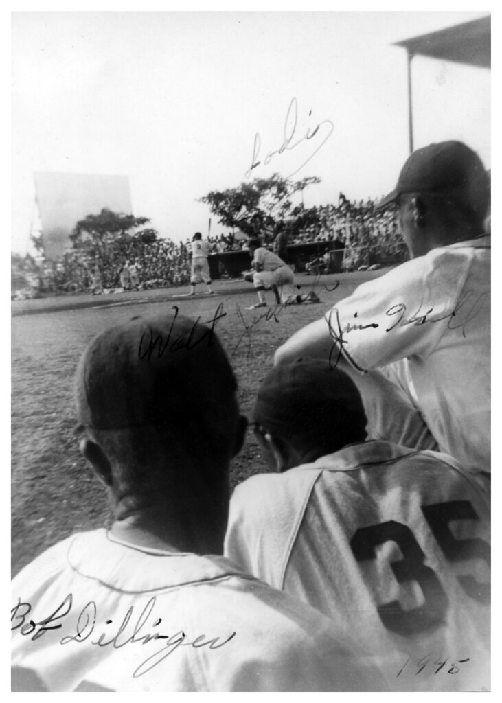 By day, the duties of the ballplayers ranged from organizing physical fitness exercises and athletic leagues to providing pre- and post-flight ground support for bombing missions. After the day’s work, the afternoon entertainment commenced with 20th Air Force league play. Scheduled for days of round-robin play on the islands of Guam, Saipan and Tinian, the men played before crowds of GIs numbering up to 12,000. Many soldiers wrote home about seeing the games, returning to their quarters with autographed balls and photos and celebrating the respite from the daily grind of the war. “Big-time baseball has accomplished more for the morale of the solders than all of the leg shows thus far presented,” Oakland, California’s George “Dusty” Rhodes wrote in a letter sent from the Pacific.[40]