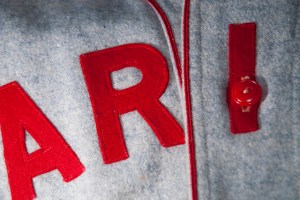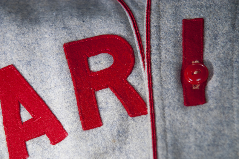 One interesting feature is the lone red button that sits atop the “I” in the “MARINES” lettering on the chest. Due to the non-standard button/hole placement, Ebbets Field Flannels was unable to replicate this with their reproduction as it didn’t align with their standard jersey templates.