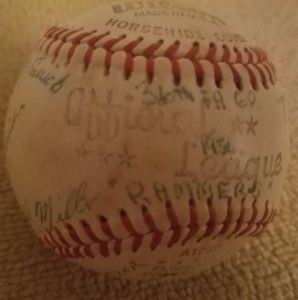 More normal wear is shown on this “Official League” stamping on the sweet spot. This is very difficult to fake (eBay image).