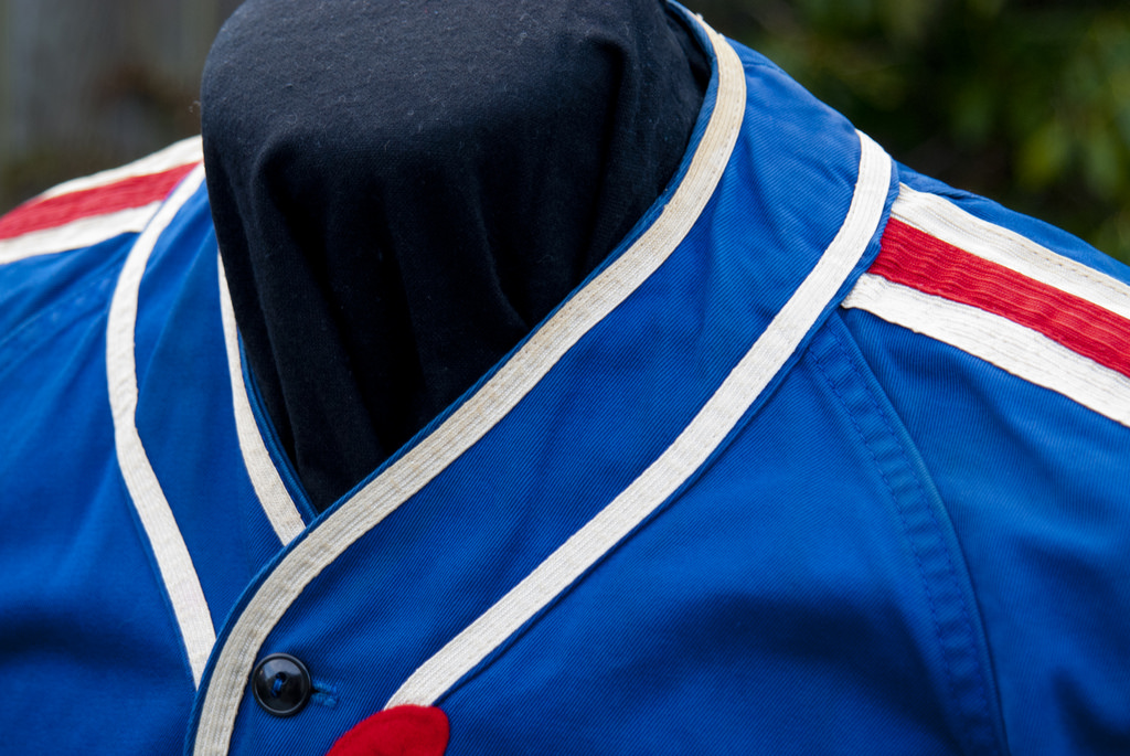 A closer look at the collar, trim, stitching and buttons.