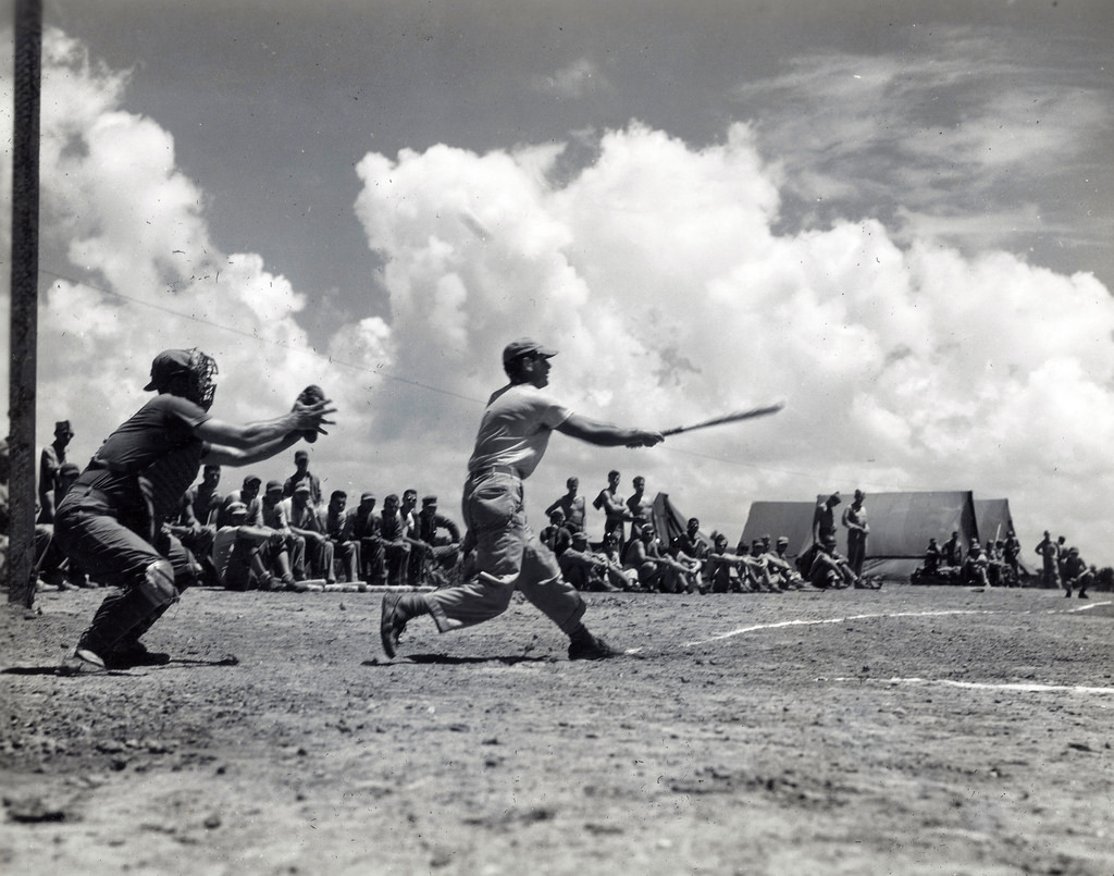 1945 USMC Intra-Squad game on Okinawa. An original photo of an inter-squadron baseball game on Okinawa, 1945. This photos was obtained from a Silver Spring, MD estate sale – from the sister of the photographer. Photo by Raymond Pullen of Milford, CT. He was attached to the 28th Photo Reconnaissance Squadron during WWII.