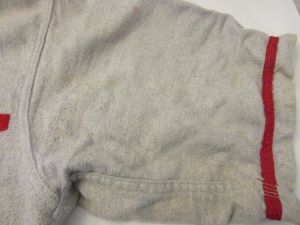 The sleeve length is six inches which indicates that the jersey was made in the 1940s. Prior to this era, sleeves were typically longer. By the 1950s, players were opting for even shorter lengths. This jersey’s red soutache also encircles the cuff of the sleeve (eBay image).