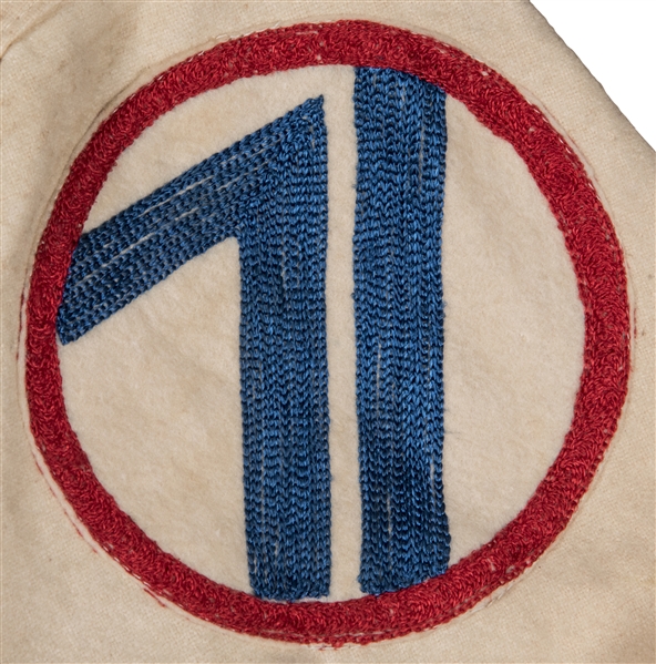 Perhaps the most appealing visual element on the jersey is this chain-stitched-on-flannel shoulder sleeve insignia of the 71st ID (image source: Goldin Auctions).