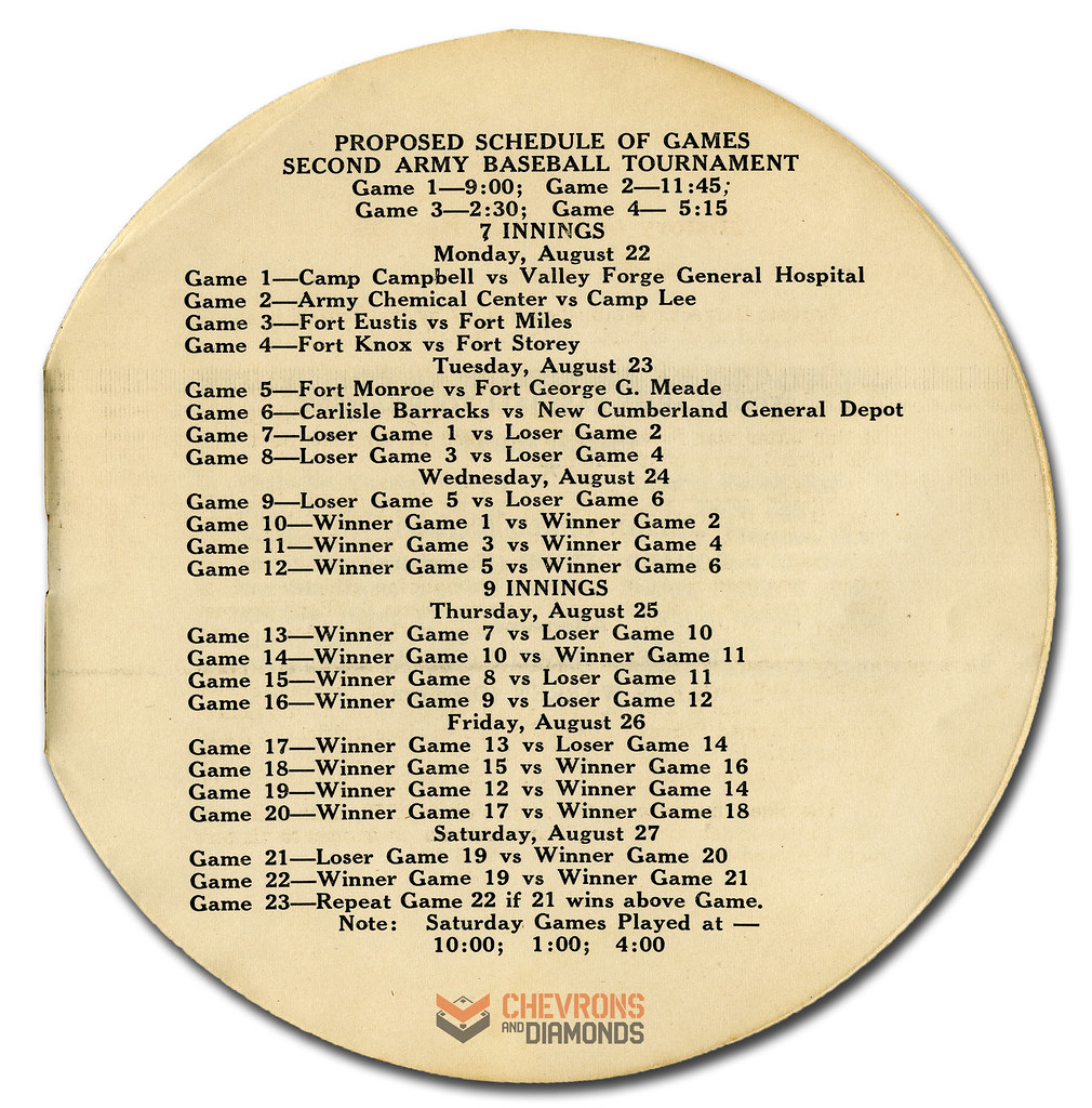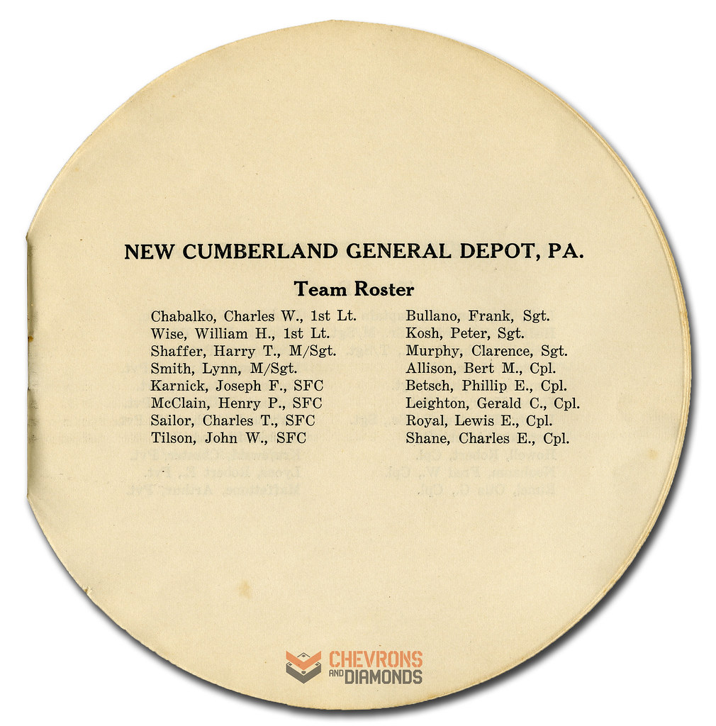 The 2nd Army’s 1949 baseball championship was held at Carlisle Barracks in Carlisle, Pennsylvania from Monday, August 22 through Saturday, August 27 and featured 11 teams from four states.