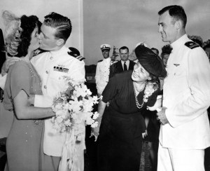 October 8, 1944 – Former baseball player marries. LT (jg) Sam Chapman, Naval Flyer and former baseball player with the Philadelphia Athletics, looks on as his best man, LT Robert D. Gibson, of Unionville, MO, greets his bride following the Chapman wedding at the Navy Chapel at Waldron Field, Texas. The bride is the former…