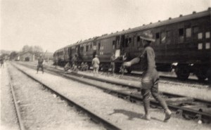 Original snapshot photo of American soldiers of the 354th Infantry Regiment, 89th Division playing catch alongside a hospital train in France in 1918 (Chevrons and Diamonds Collection).