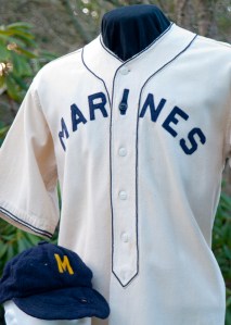 The 1943-44 home white Marines baseball jersey and cap. In a decade of searching, this is the first white Marines jersey (clearly the home counterpart to the road gray/red uniform).