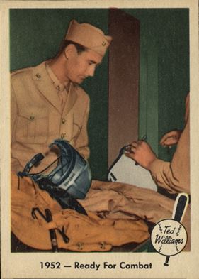 1959 Fleer Ted Williams #46 – Williams is shown drawing his pilot gear in this card titled, “1952-Ready For (Combat).”