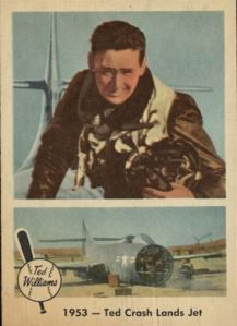 1959 Fleer Ted Williams #47 – Titled, “1953-Ted Crash (Lands Jet)”, this card depicts William’s Grumman F9F crash-landing following receipt of enemy ground-small arms fire.