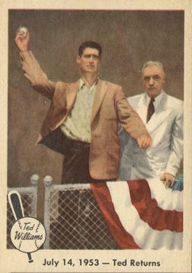1959 Fleer Ted Williams #48 – Titled, “July 14, 1953-Ted (Returns),” Williams returns from the Korean War in time to throw out the first ball in the ’53 All-star game.