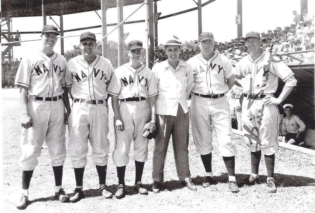 In this photo from the estate of Yankees Hall of Fame catcher, Bill Dickey, Mize poses at Furlong Field with other Navy stars from the Major Leagues. Shown, left to right are: George “Skeets” Dickey, Johnny Vander Meer, Pee Wee Reese, Joe Rose, Johnny Mize and Bill Dickey (Mark Southerland Collection).