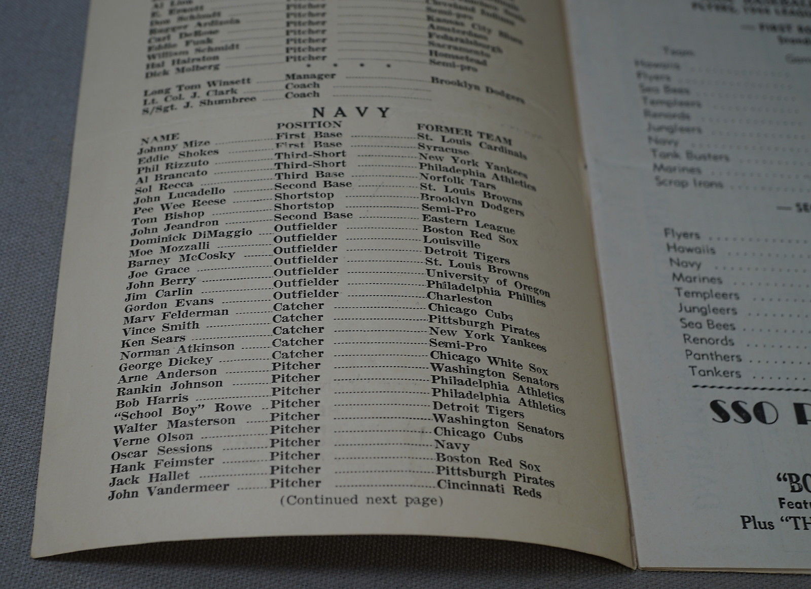 Headlining the Navy roster are the likes of the Dodgers’ Pee Wee Reese, Johnny Mize of the Cardinals and Johnny Vander Meer of Cincinnati (source: eBay image).