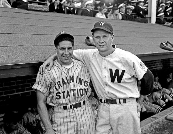 Phil Rizzuto and Gene “Jerry” Priddy, Yankees teammates in 1942 face each other on the Norfolk NTS Bluejacket’s opening day, April 2, 1943 (photo by Charles Borjes, courtesy of the Norfolk Public Library).