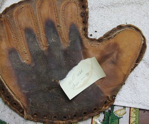 With the inside of the mitt exposed, Don indicates the an area that has leather that is suitable for the baseball. The darkened area shows the impact of sweat-staining from the original owner’s game-usage (image source: Don Droke).