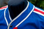 The highlight feature of this uniform set is the soutache that extends from the collar, across the ridge of the shoulder down to the edge of the sleeve cuff. Constructed from a rayon weave, this trim features a 3/4-inch brilliant red band that slightly overlaps two 1/2-inch white bands (forming a broad, two-color stripe), contrasting quite distinctively over the rich blue colored base fabric. The two-color soutache is also found on the trousers on the outer seam of each leg, reaching from the waistband to the cuff-edge of the legs. Two 1/2-inch wide bands of the same rayon trim encircle the collar and meet below the last button on the jersey’s placket. The bottom of each sleeve also features the same, 2 bands of 1/2-inch white rayon trim.