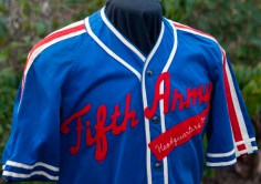 There are no markings, tags or other details that could help to provide a specific date that this uniform was used. However, research provides a little insight that does help to answer the age question. Considering the name on the jersey, “Fifth Army,” this designation was used until the Fifth Army was deactivated in October of 1945. The Firth Army was formed in 1943 in French Morocco and would serve in the Mediterranean on the Italian front. Following the end of hostilities, the Fifth Army would dominate the athletic leagues formed between European and North African units, winning championships with their baseball teams. Further research regarding the Headquarters Company team is forthcoming.
