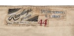 - Tag: An early 1940s Rawlings manufacturer’s information tag (inscribed with Red Circler’s first baseman’s name) is sewn inside and below the back of the waistband along with the size tag (38) and the “Special Services U.S. Army” tag.