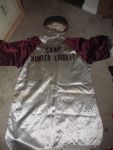 - Material: The base material is cream-colored (home white) satin. The sleeves are of the raglan design and made of a burgundy-colored satin.
