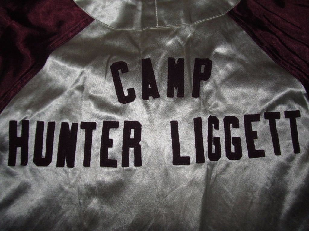 What makes the military baseball uniform unique beyond it being the only one that I have found is that it is directly attributed to a specific Army installation. Camp Hunter Liggett and that it is made of the rarely seen satin material. The uniform jersey’s manufacturer tag that shows it was made by A. G. Spalding & Brothers, the design of which indicates that the uniform dates to the early years of the fort; between 1941 and ’42 (the tag was used by Spalding from ’34-’42). Though it is difficult to discern from the photos, the block lettering on the chest (“ARMY”) and back (“Camp Hunter Liggett”) appears to be made from a burgundy-colored athletic felt (see Satin on Diamonds: a Rare WWII Army Baseball Uniform for more details).
