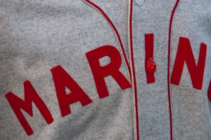 Perhaps the most common or readily available World War II-vintage military baseball item of the past several years is this road gray, 1943-44 Marines jersey. In the past year (2017) alone, there were more than a half-dozen (in varying conditions ranging from very rough to pristine) jerseys and uniform sets listed for sale in online auctions. A standard feature of these WWII jerseys is the non-standard button hole alignment, the result of which places a button centered in the lettering on the placket. The lone red button for this particular position matches the red coloring of the wool felt letter on which it rests when the buttons are fastened. In the spring of 2017, a home (white) version of this jersey surfaced and was added to this collection.
