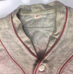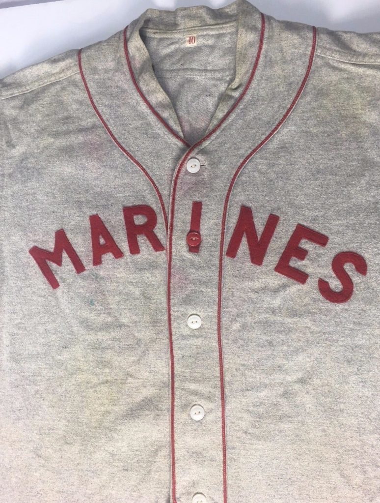 Perhaps this uniform is the most common seen listed for sale at various antiques and auction sites, however this individual jersey has something that sets it apart from every other World War II road gray Marines uniform. While every other appearance of this jersey lacks any additional appointments, the back of this jersey has been modified with red athletic felt numerals. As can be clearly seen in the images, the numerals were (most likely) constructed of different materials than the lettering that is applied to the front which caused the colors to bleed with improper laundering techniques. The unfortunate bleeding has caused irreparable damage with the most intense discoloring occurring in the material immediately adjacent to the numbers. However, the entire jersey has a red hue that takes away from the overall appearance of the jersey. In addition to the color damage, the uniform is highly soiled from game-use.