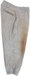 The uniform shown on this page was worn by Stan Musial in 1945 and most-likely is the same one he wore in the 1945 All-Star series games. It is a gray wool flannel uniform with simple navy blue block athletic felt lettering spelling out “N A V Y” in an arc across the upper chest. On the reverse are athletic felt numerals matching the font and color of the lettering on the chest. As Musial was a taller man (6′), the jersey is long and features seven gray plastic, four-hole concave buttons. The design of the sleeves and the bottom of the shirt tails is consistent with those of the 1940s. Both the jersey and trousers have manufacturer (Wilson Sporting Goods) and size tags which are correct for the period.