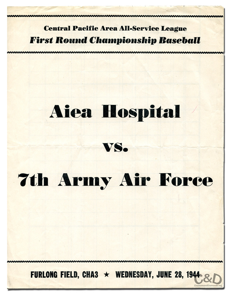 From the start of the 1944 season, the Aiea Naval Hospital “Hilltoppers” were the odds-on favorite to capture the Central Pacific Area (CPA) League crown and and were well on their way during the first half of play. However, by June, the 7th Army Air Force received a substantial infusion of talent from the mainland West Coast that was predominated by major league talent. As the season continued, the 7th added former Yankees Joe Gordon and Red Ruffing to their squad. Aiea captured the first half championship and in the second half. fought neck-and-neck with the 7th.