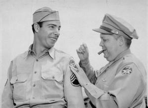 S/Sgt. Joseph P. DiMaggio (left) of San Francisco, California, former New York Yankees’ star slugger, gets some help from Brig. Gen. William J. Flood, sponsor of the 7th Army Air Force overall sports program, in sewing on his shoulder patch on June 9, 1944. DiMaggio reported for duty with the 7th AAF in the Central…