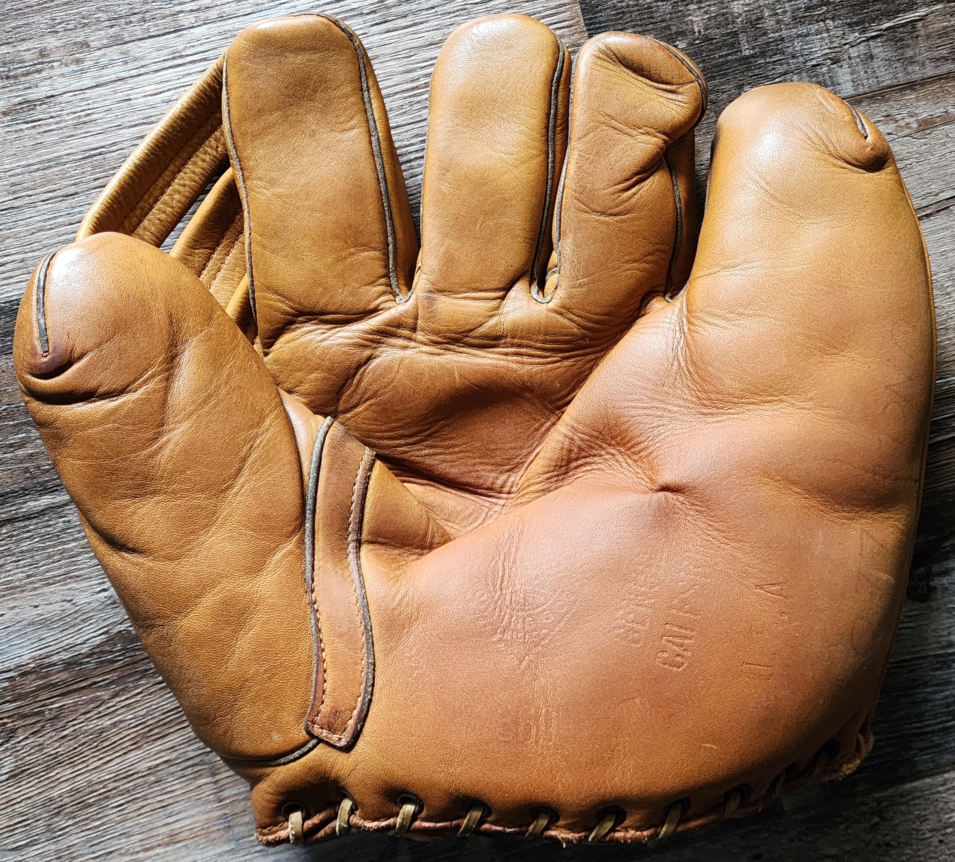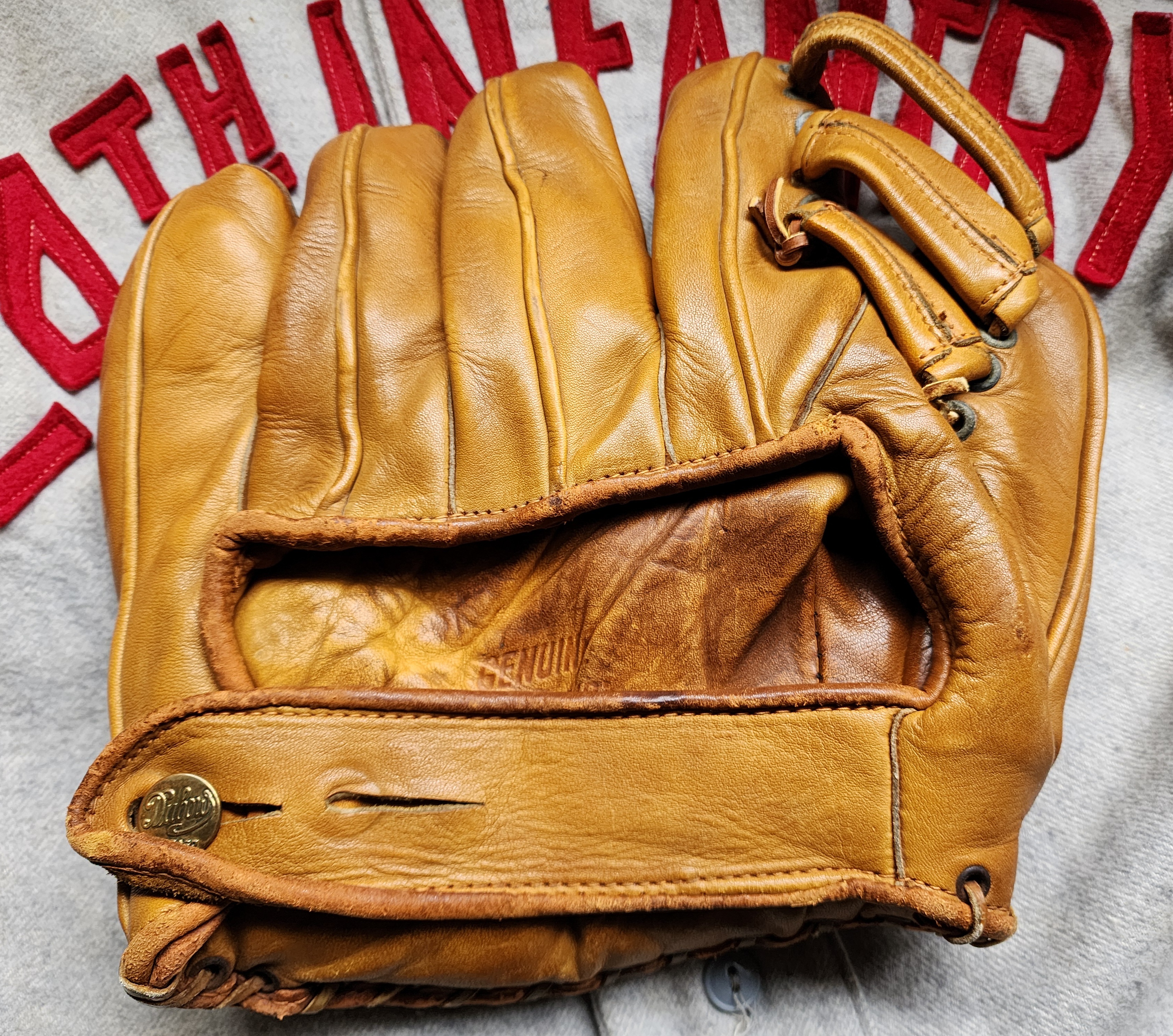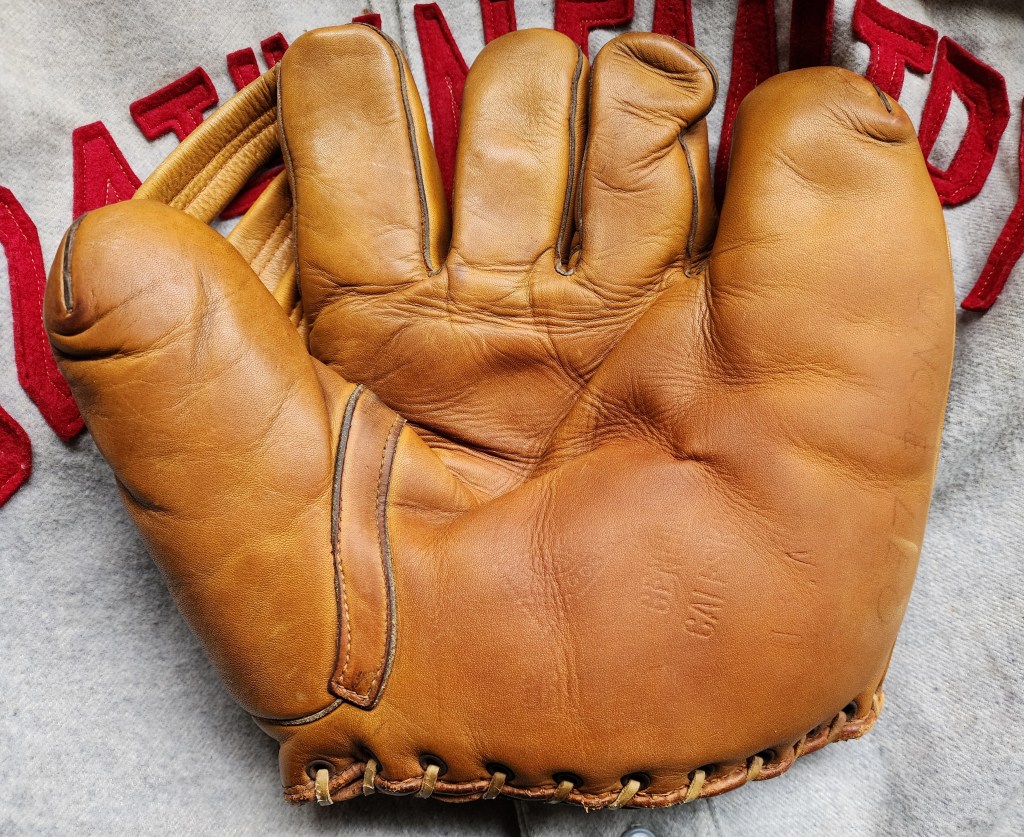 This split-finger Dubow Professional Model 369 features matching leather edge binding, a triple-tunnel web, is stamped “U.S.A.” on the palm heel. The underside of the wrist strap bears an ink-stamped “102.”