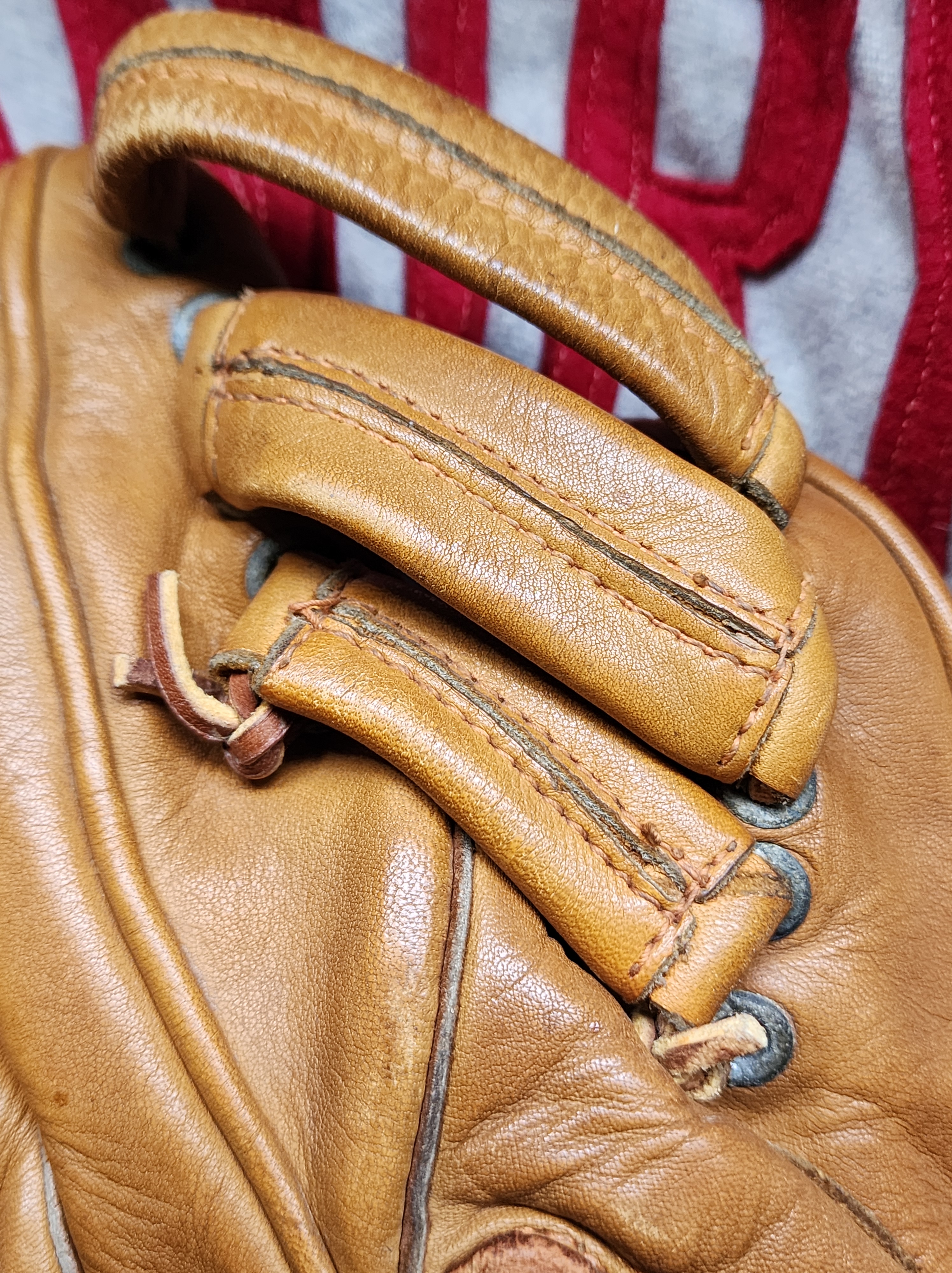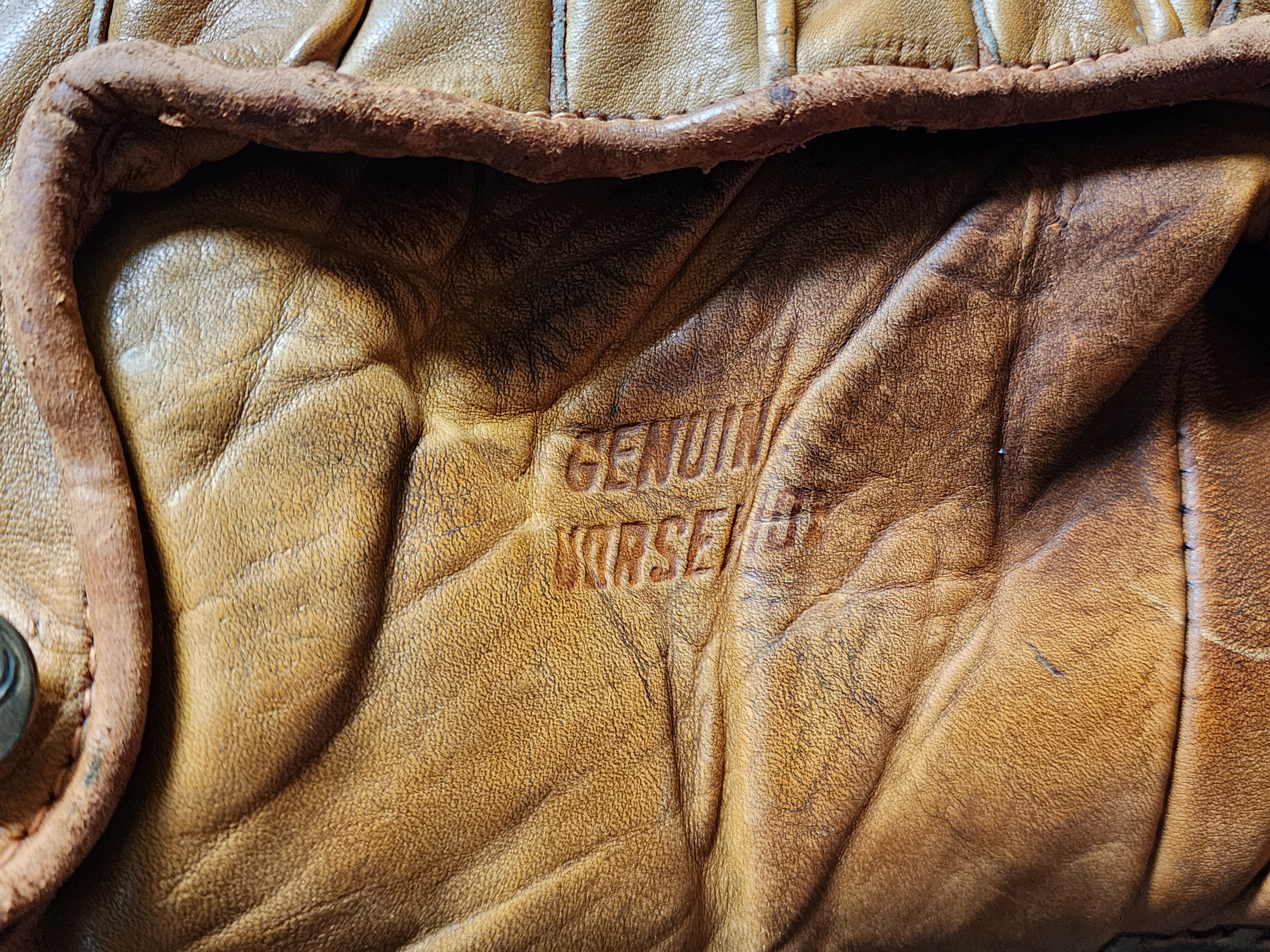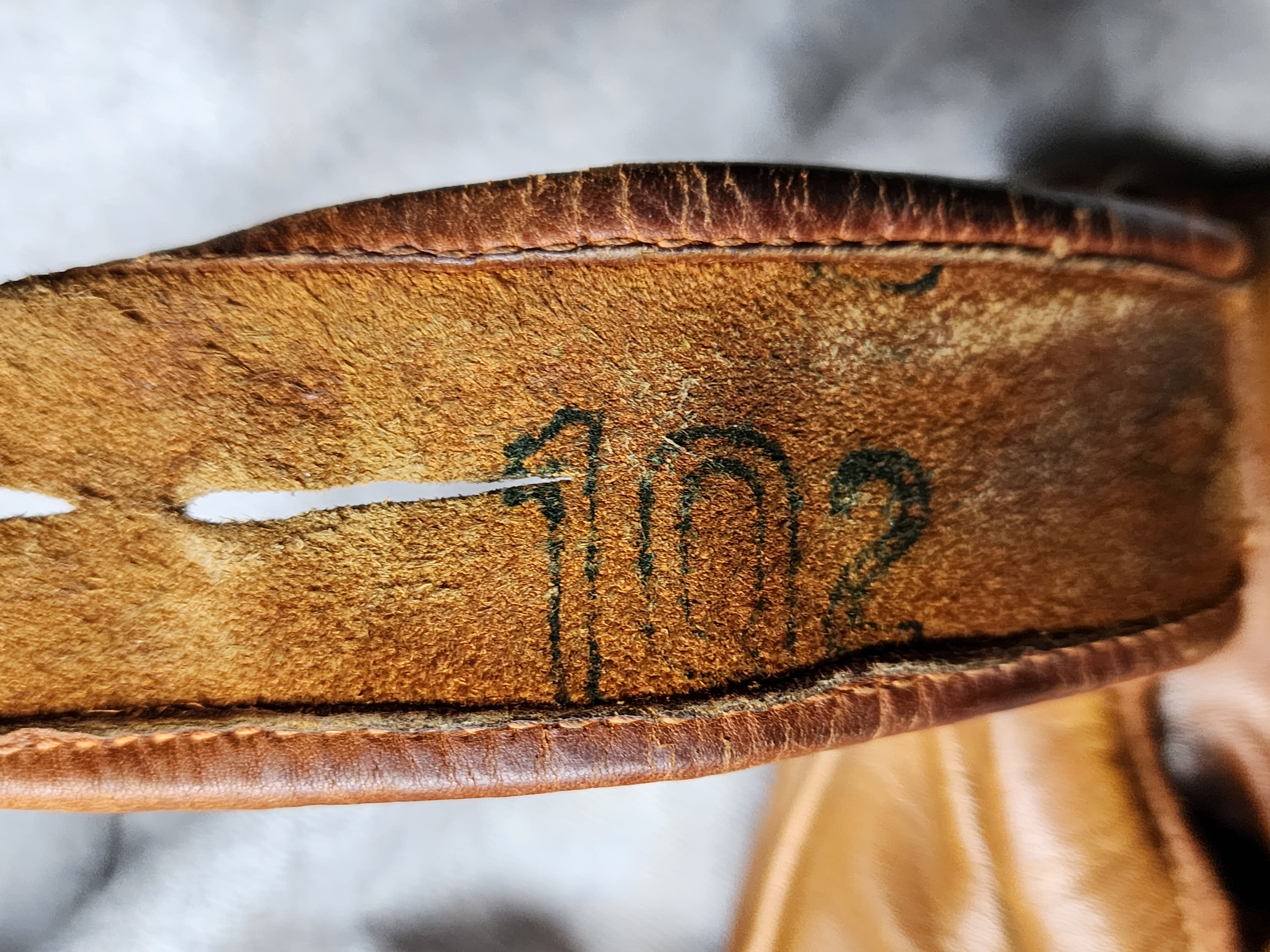 This split-finger Dubow Professional Model 369 features matching leather edge binding, a triple-tunnel web, is stamped “U.S.A.” on the palm heel. The underside of the wrist strap bears an ink-stamped “102.”