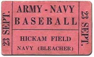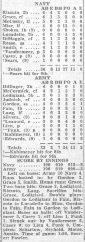 In the top of the the ninth, Navy’s Johnny Lucadello’s fly to left registered the first out. Dom DiMaggio worked the pitcher for a free pass. Pee Wee Reese singled over the shortstop. With two on, Vinnie Smith hit a hot comeback to pitcher Al Lien who deflected the ball allowing DiMaggio to score. After Eddie Funk relieve Lien, Navy manager Bill Dickey sent Ken “Ziggy” Sears in to pinch hit for Vander Meer. Funk got Sears fly out but walked the next batter, Rizzuto, to load the bases. With two outs, right fielder Joe Grace took Funk deep to right field clearing the bases and putting the game out of reach for the Army. Navy left fielder McCosky followed Grace with a pop foul that was fielded by the backstop Leonard.