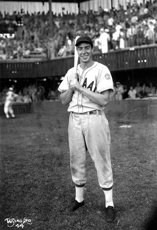 Two seasons removed from his last year with the Yankees, Sgt. Joe DiMaggio is pictured at Honolulu Stadium in early June 1944 (Chevrons and Diamonds Collection).
