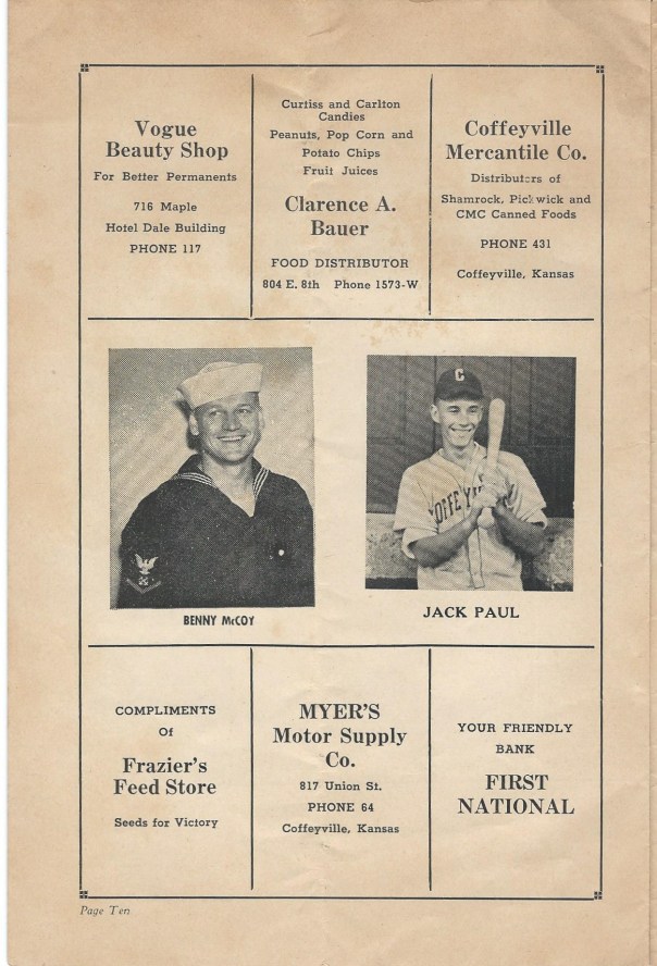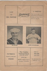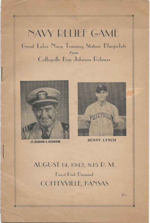 Exhibition games between service and professional teams were held throughout World War II. This scorecard from August 14, 1942 is quite extensive and detailed providing publicity photographs of individual players on both squads. The game was scheduled as a fund-raiser for Navy Relief with a portion of the proceeds covering the cost of the Bluejackets’ travel to Coffeyville, Kansas.