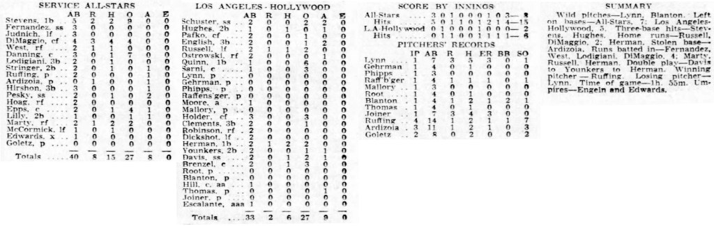At the opposite side of the country, another fund-raising game was organized by comedian and actor, Joe E. Brown with the goal of using the monies raised to purchase sporting equipment for soldiers, Marines, airmen and sailors serving in the Pacific theater. The All Pacific Recreation game saw the host Pacific Coast League take on a squad of service all-stars, Instead of a blended roster of players from the two representative teams (the Los Angeles Angels and Hollywood Stars), the two squads split the game with each playing 4-1/2 innings.. The game was played at Gilmore Field in Los Angeles (home of the Angels) and raised more than $25,000 (see: A Passion for the Troops: Joe E. Brown’s All Pacific Recreation Fund).
