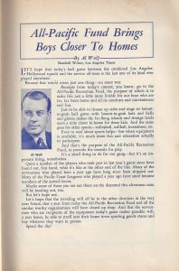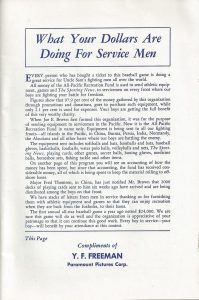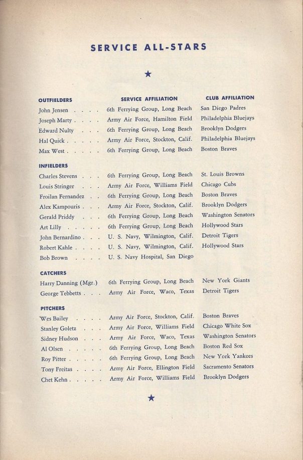 Building upon the success of the 1943 All Pacific Recreation Fund game between the Service All-Stars and the Pacific Coast League’s Los Angeles Angels and Hollywood Stars, actor/comedian Joe. E. Brown scheduled another fundraiser game between the two squads. The rosters featured many of the same faces with the Service Team All-Stars roster seeing the loss of Joe DiMaggio and Johnny Pesky along with a few other key players. The formula was the same as the previous year’s game regarding the rotation of the two Coast League squads at the game’s mid-point. The game was played at Gilmore Field in Los Angeles (home of the Angels) and raised more than $71,000 (see: Service All-Stars Raising Funds on the Diamond for their Comrades in the Trenches), outperforming the 1943 game.