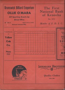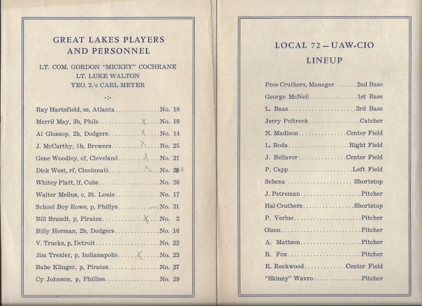 This oversized scorecard (12″ x 9″) 1944 from a game between the Great Lakes Naval Training Station team vs Kenosha local UAW local 72 is rather unique. The cover is very clearly union-centric with the design (including the layout, fonts, artwork) and messaging and very unlike other wartime service team scorecards. The card also features two