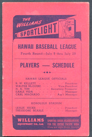 With further research and (hopefully) uncovering more scorecards, programs and newspaper articles, more light will shine on and illuminate some of the information contained herein. The back page lists the “Fourth Round” schedule along with the teams, dates and times of each game to be played at Honolulu Stadium. Still to be determined are the specifics surrounding the other teams listed, Athletics, Braves, Hawaii, Tigers, Wanderers and Navy.