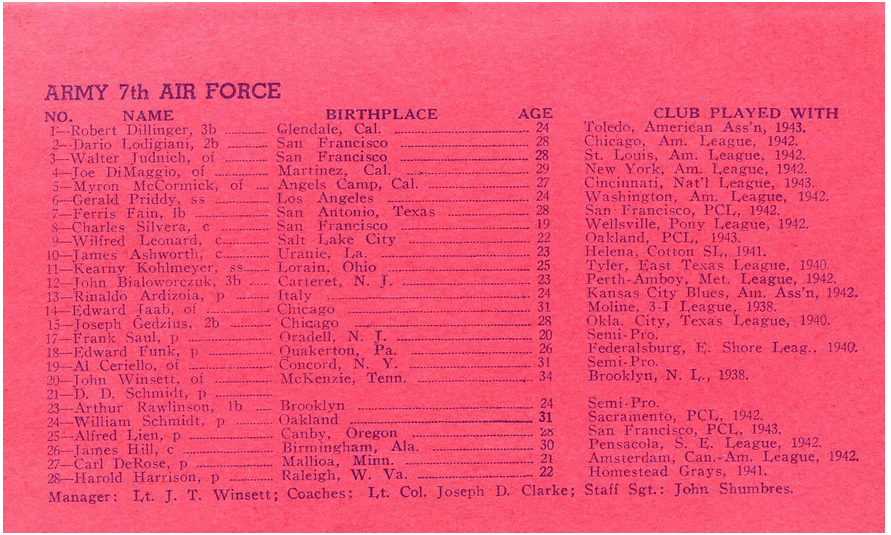 The Army 7th Air Force team would go on to dominate within the league as their roster was loaded with major league and Pacific Coast League talent.