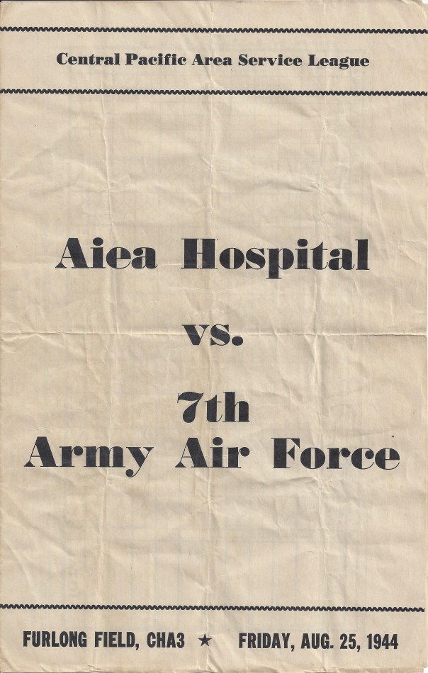 The match-up between the Aiea Naval Hospital and Seventh Army Air Forces teams was held (barring any schedule changes subsequent to the printing of the scorecard) was held less than a month prior to the 1944 Army/Navy All-Star Championship Series. According to a game two summary from that series, the 7th AAF team was a recent victor of the regular season league play.