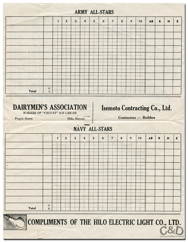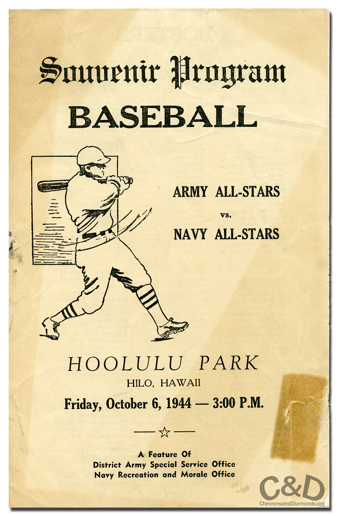 With game 10, the Army All Star versus Navy All Stars moved to the big island to Hoolulu park locate in the city of Hilo on the Island of Hawaii. The Navy, by this game, led the series seven games to the Army’s two as the military brass decided upon playing an 11 game series in order to provide for plenty of opportunity for the troops to see the stars play.