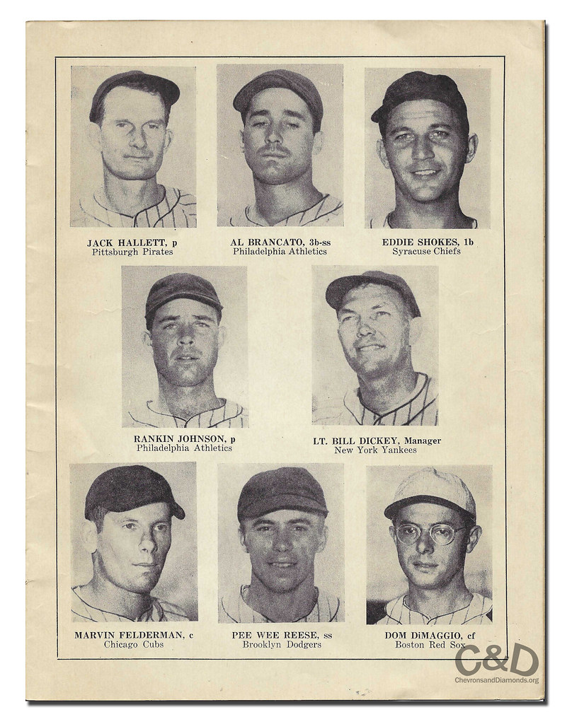 Along with this program, the Chevrons and Diamonds Collection has 12 publicity photographs that were created during the 1944 season and used for league advertising as well as the Game 4 piece. Of the dozen images, 11 were obtained from Al Brancato’s personal memorabilia collection as he was diligent in capturing artifacts and building an impressive archive documenting his World War II service along with his professional career. The photo of Ferris Fain was obtained separately from an online auction and shows the future major leaguer in his 7th Army Air Force flannels.