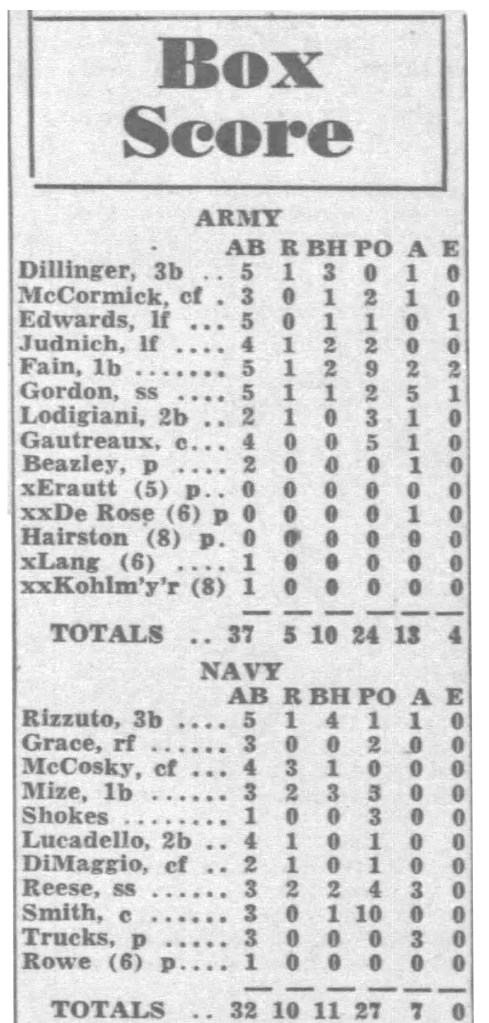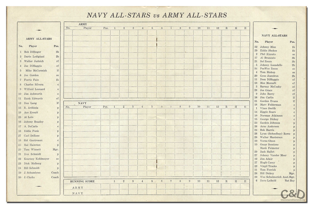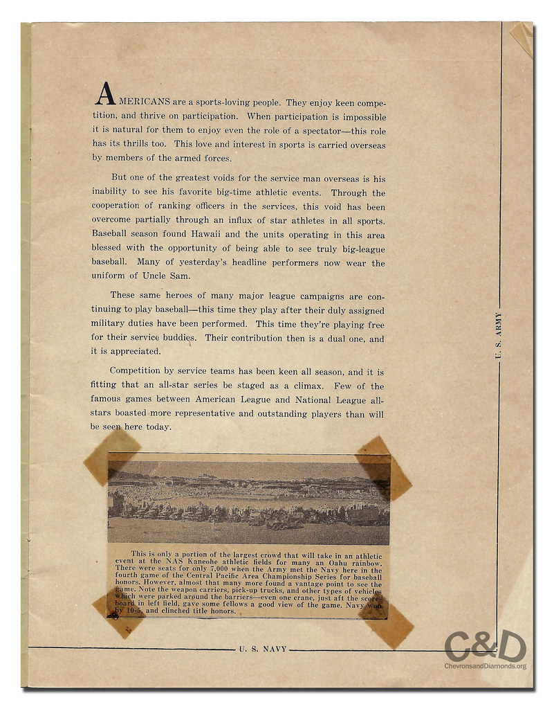This scorecard originates from what is often referred to as the 1944 Army vs Navy World Series. This particular game (the fourth of 11) was played at Naval Air Station Kaneohe Bay on September 27, 1944. The ballpark seating held 7,000 but 10,000 GIs packed the stands and lined the field to watch a fourth consecutive victory for the Navy All-Stars as they pummeled the Army squad, 10-5.
