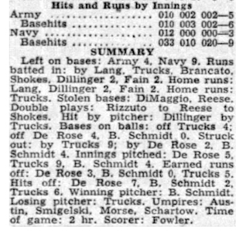 This scorecard originates from what is often referred to as the 1944 Army vs Navy World Series. This particular game (the seventh of 11) was played at Furlong Field, at Pearl Harbor Civilian Housing Area 3 on October 1, 1944. After losing the first four games (and, subsequently the series), the Navy won games five and six before the Army finally claimed their first victory in this game by a score of 5-3.
