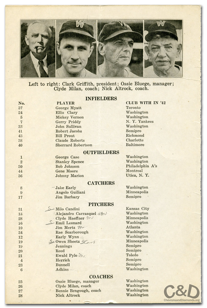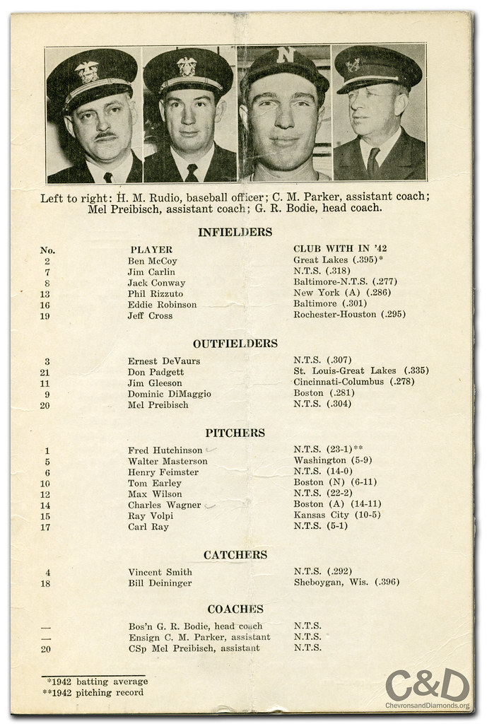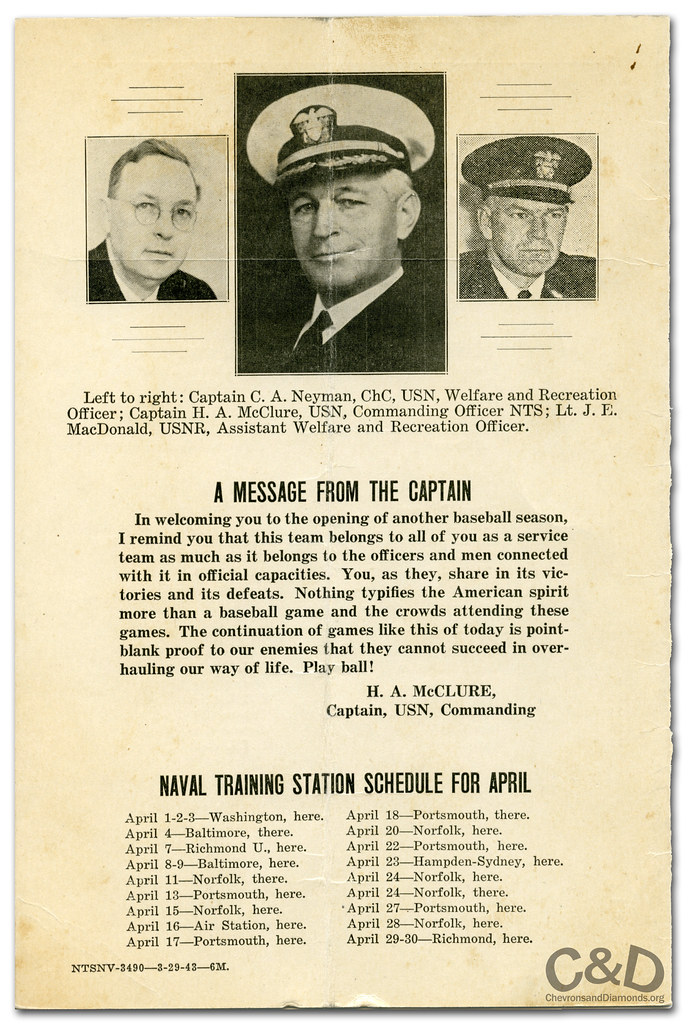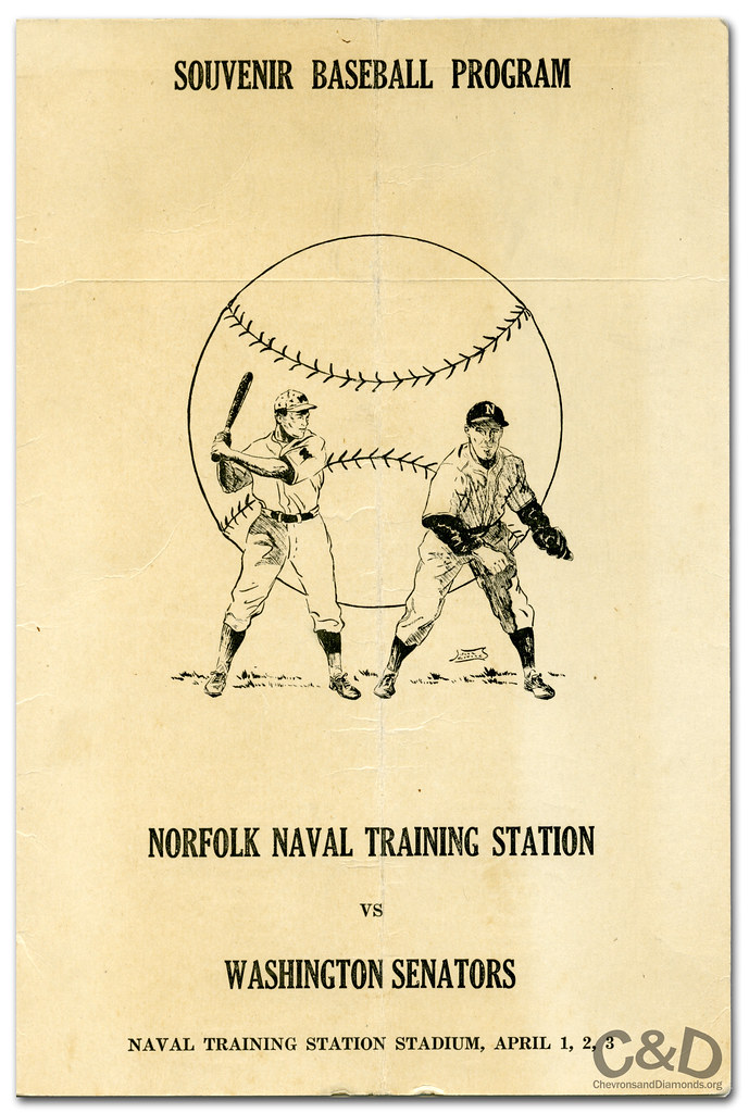 With the 1942 season fully in the rear view mirror and the departure of key players (including Bob Feller and Sam Chapman), the retooled and heavily re-stocked 1943 Norfolk Naval Training Station Bluejackets roster was, perhaps the most formidable base or command team in the armed forces. This program showcases the ’43 team’s opening weekend series against the Washington Senators ahead of the Major League Baseball opening, played on April 2, 1943.