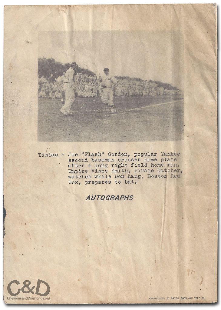 The back page includes and action photo of Joe Gordon with a caption that reads, “Tinian – Joe “Flash” Gordon, popular Yankee second baseman crosses home plate after a long right field home run. Umpire Vince Smith, Pirate Catcher, watches while Don Lang, Boston Red Sox, prepares to bat.”