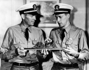 LT. William Dickey (left), Yankees catcher and Ensign William Hulse, whose 4:06 mile was the fastest ever run by an American (at that time), examine a model of a battleship. They are shown at U.S. Naval Training School (indoctrination), Fort Schuyler, The Bronx, NY, July 3, 1944(Chevrons and Diamonds Collection).