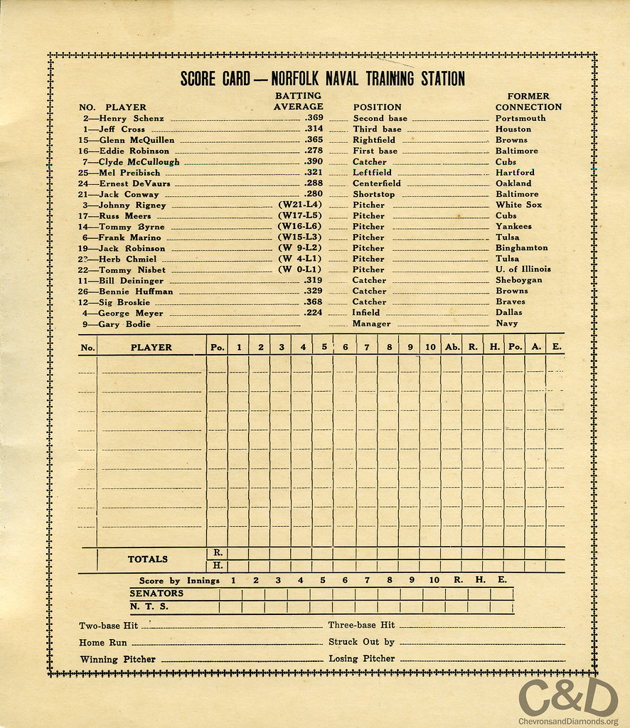 Unique to the 1944 Norfolk Naval Training Station scorecards is the facsimile autograph page on the back cover. These were also seen with some Great Lakes Naval Training Station pieces. In the past few years, these panels have been listed in online auctions as “authentic” autographs.