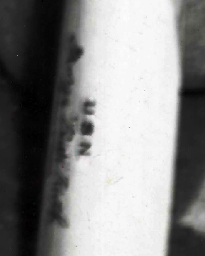 On the barrel of Pesky’s bat, “U.S.N” is branded directly above the burned-in signature of George “Babe Ruth (Chevrons and Diamonds collection).