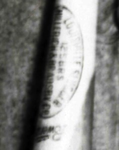 Plainly visible in the Louisville Slugger center brand is the marking “125BRS” indicating that Johnny Pesky’s bat is a consumer model rather than a professional bat (Chevrons and Diamonds collection).